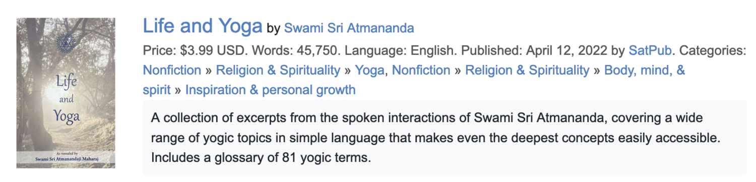 Announcing the eBook release of Swamiji’s latest book, Life and Yoga, now available at Smashwords, Apple Books, Amazon Kindle, Kobo, Barnes & Noble and more. First page preview: